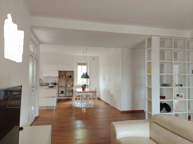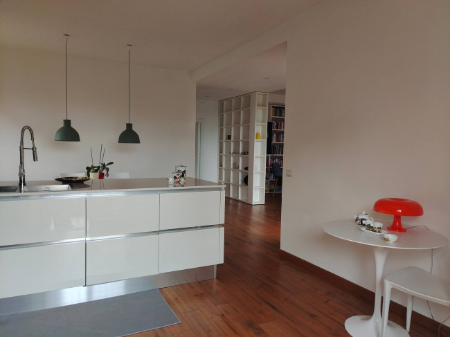 Questo appartamento, situato al primo piano di un edificio anni '80 con sole quattro unità abitative, offre un accesso indipendente attraverso una scala esterna. Entrando, si viene accolti da un ampio open space che comprende una cucina moderna con penisola e un soggiorno luminoso con balcone.
